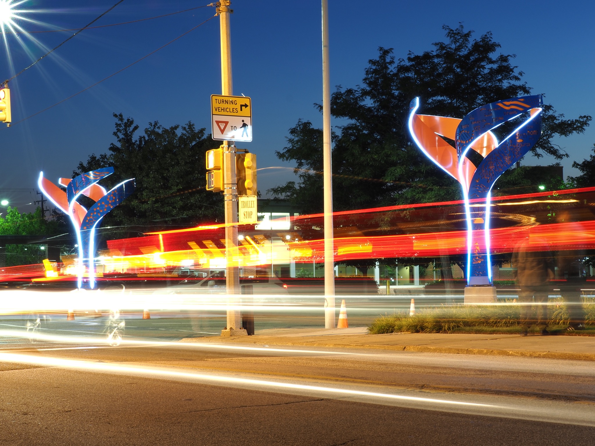 The City of Erie provided guidance on buried utilities, structure placement, engineering, electrical connection, and sidewalk applications. They will also provide the forthcoming sidewalk and cross walk design upon their planned streetscape plan execution at this location. The City of Erie is the owner of the sculptures, making this piece the first public art piece in the City’s public art collection.
